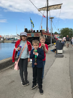 Lapset saivat vierailla keskiaikaisen kogin kopiossa - miehistö kertoi, että tämä oli saapunut tänne Ruotsista kahdessa vuorokaudessa. / Barnen fick besöka en kopia av en medeltida kogg, denna inseglad från Sverige på cirka två dygn, berättade besättningen.